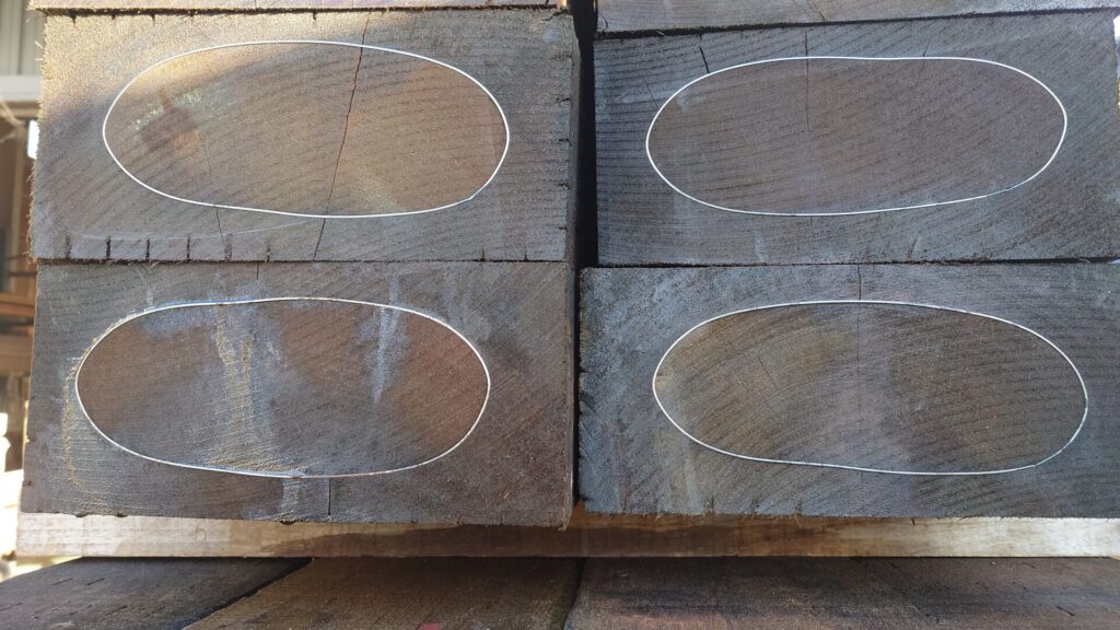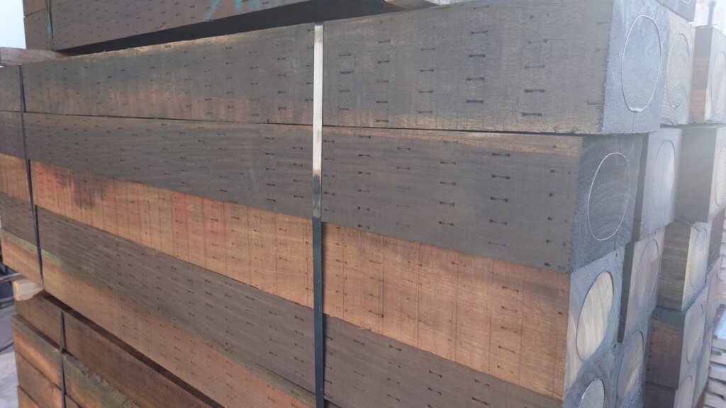 あらかじめ木材表面にインサイジング(意図的な切り込み)加工を施し、その後防虫・防腐剤を加圧注入しています。